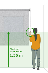 Die Norm besagt unter anderem, dass Zugschnüre und Bedienketten für Rollos und andere Sonnenschutzanlagen, um die Gefahr der Strangulation für Kleinkinder zu minimieren, in einer Höhe von mindestens 1,50 m über dem Boden angebracht sein müssen. Wir bitten Sie, dieses Maß zu beachten. Da wir nicht wissen können, in welcher Höhe Sie die Anlage montieren möchten, lassen wir auch andere Maße als die ab Werk vorgegebenen zu. Wir müssen aber darauf hinweisen, dass die von Ihnen gemachten Angaben dazu führen können, dass die Anlage nicht mehr den Regelungen und Normen zur Kindersicherheit entspricht.