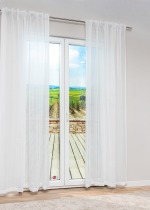 Dieser durchsichtige Schlaufenschal lässt viel Tageslicht in den Raum, schützt aber nur bedingt vor fremden Einblicken. Das fein gesäumte, nach ÖKO TEX Standard 100 zertifizierte Polyestergewebe hängt wie ein Schleier vor der Glasfront, dämpft die Fensterszene und fügt sie sanft in das Ambiente des Raumes ein. Die zarten Wellen des in vertikalen Falten gelegten Stoffes ergänzen das betont schlichte Design. Der Gardinenschal eignet sich gut für Kombinationen mit kräftigen Umgebungsfarben. So können weitere Schals leicht dahinter gestaffelt werden, um deren kräftige Kontraste auf diese Weise zu modulieren. Überschneidungen und neue Farbmischungen werden so möglich. Ob als dezente Komplettlösung oder sinnvolle Ergänzung zu weiterer Fensterdeko, dieser Schal macht sowohl in modernen, als auch in klassischen Wohnumgebungen eine gute Figur. Die Schlaufenbefestigung funktioniert an jeder Gardinenstange, schnell und kinderleicht. Die Reinigung erfolgt im Schonwaschgang der Maschine.